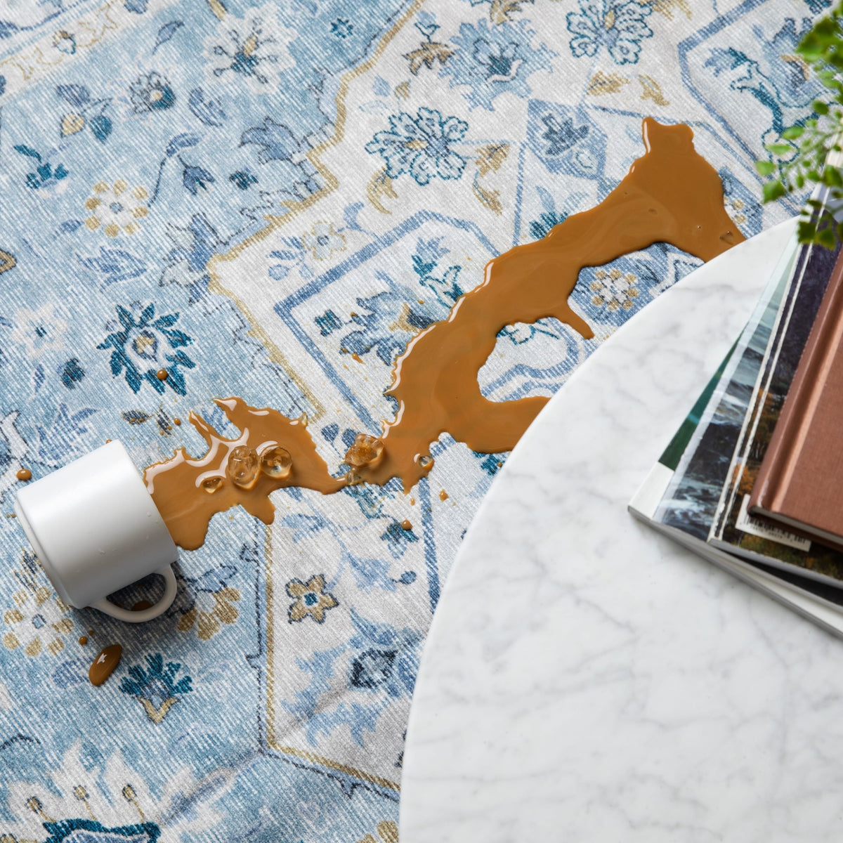 Our rugs are coated with a water-based solution that is commonly used in medical and outdoor clothing. This coating helps separate oils, stains, or liquids from the fabric, preventing any absorption.